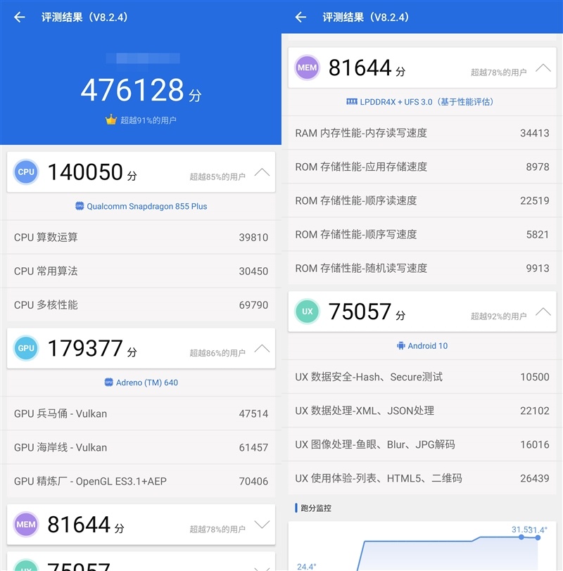 小米10 Pro的综合分数为552248分。作为对比,笔者挑选了一款骁龙855 PLUS旗舰机同样进行了测试。可以看到CPU和GPU部分均有着10%-20%的提升,而内存方面的得分也有着10%左右的增幅