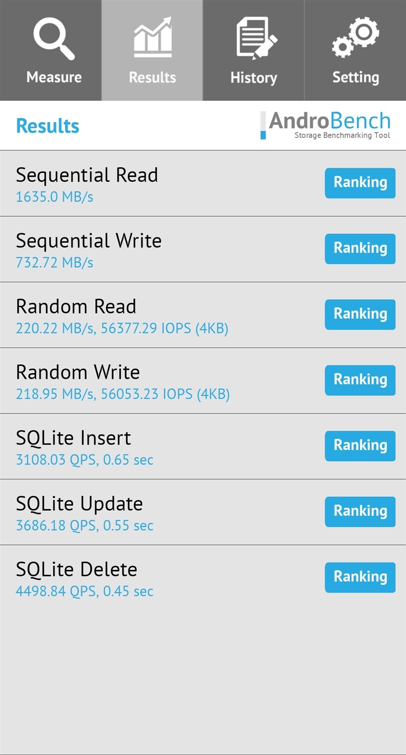 AndroBench是一款闪存测试软件,其可以测试连续读写、4K随机读写、数据库速度等。