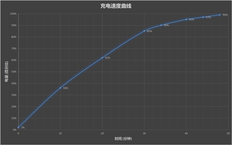 实际测试的由2%电量充至99%电量用时约48分钟,基本可以肯定50分钟内即可充满。笔者顺便也测试了一下充满后的发热情况,最热的地方为充电线连接处,但温度不高,仅有36.3℃。