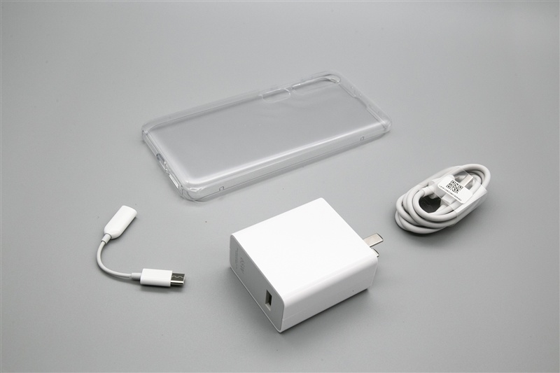配件方面,随机附赠有一个透明保护壳、3.5mm耳机转接头、充电线以及一个最大支持65W PD快充的充电器。