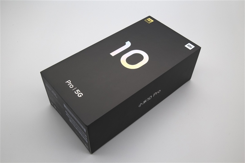 小米10 Pro的包装盒风格变化明显,主打色调变为了深邃的黑色。中间一个大大的10,随着光照会产生不一样的色泽。在包装盒的左上角,可以看到一个特殊的黄色标识,既Hi-Res Audio音频认证,这次的小米10 Pro在音频上会有大惊喜。