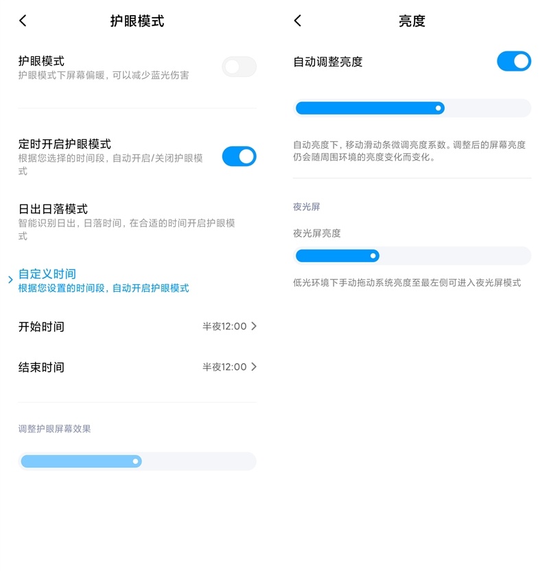 而这块屏幕的素质也非常高。最高1200nit的亮度,平均色差小于1.11,JNCN小于0.55,观感细腻的同时色彩不会出现太大的偏差。在系统的显示设置中,也提供了丰富的选项供用户调节。像护眼模式,可以设定时间自动开启减少蓝光;亮度调节的级数非常多,调整起来非常细腻,在最低亮度下的夜晚环境中,还有夜光屏调节帮助你找到最合适的亮度。自动亮度也正如雷总所说,正反双亮度传感器,让自动亮度的调节非常人性化及灵敏。