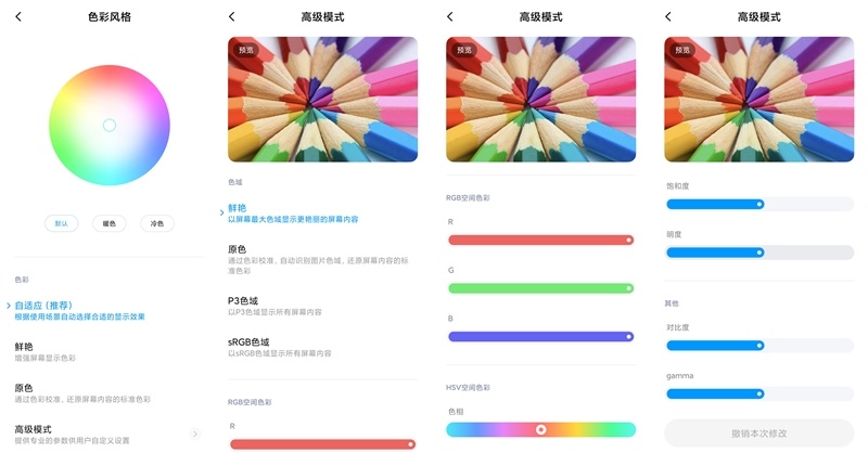 小米10 Pro的色彩风格设置选项也堪称全面,对于小白有鲜艳、原色、暖色等简单易懂的色彩可选;对于有专业需求的用户,同样有按照色域分类,甚至自行调节颜色、亮度、对比度的高级模式可用。