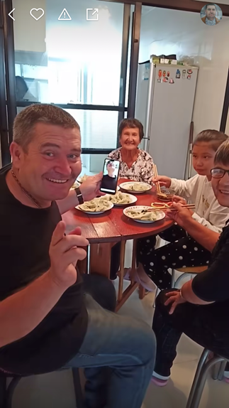 而在距离北京1700公里的黑龙江省逊克县,东北农民彼得洛夫在中秋这一天,打给了在湖北无法赶回家团圆的儿子,“我们大家都很想你啊”。除了妈妈在远处充当摄影师拍快手,一家人整整齐齐地坐在摆满饺子的饭桌边,和儿子唠唠家常。